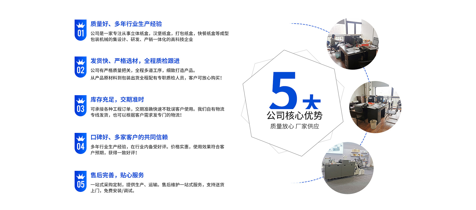 瑞安市中法機械有限公司是一家從事立體紙盒機,漢堡紙盒機,打包紙盒機,快餐紙盒機等成型包裝機械的設計、研發(fā)、產銷一體化的高科技企業(yè)。公司有現(xiàn)代化的管理體系和完善的售后服務體系;有一支具有充滿青春活力的精銳研發(fā)團隊!自成立以來,中法公司堅守“誠信、學習、發(fā)展”的企業(yè)發(fā)展理念,堅持“以誠信為道、以質優(yōu)取勝”的經營原則,在市場競爭中取得了良好的社會和經濟效益!